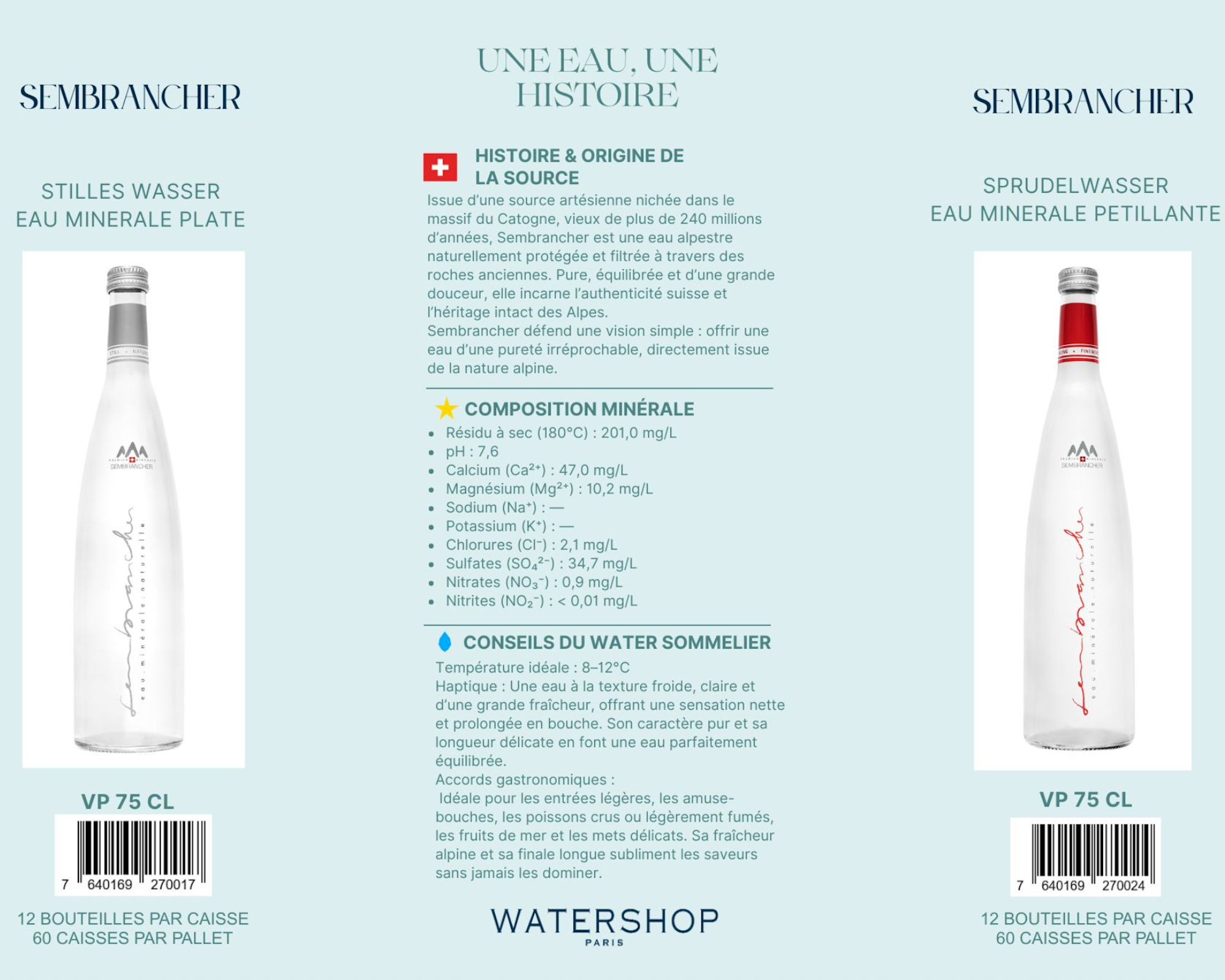 Le partenariat entre Sembrancher et Watershop, initié en 2025, repose donc sur une vision commune : créer de la valeur autour de l’eau, en la respectant tel un patrimoine naturel et non comme un simple produit de consommation. Ensemble, ils défendent la notion d’une hydratation plus juste, plus saine et plus respectueuse de l’humain et de l’environnement. Watershop privilégie ainsi des marques engagées (écoconscience, écoresponsabilité) et des packagings plus responsables (bouteilles en verre, pas de plastique…).